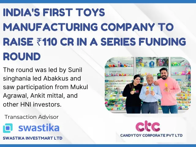 Candytoy Corporate Pvt Ltd (CTC), a prominent manufacturer of promotional toys and confectionery based in Indore (M.P), has successfully raised INR 110 crore in a series A funding round, which is backed by a group of domestic investors, high-net-worth individuals (HNIs), angel investors and institutional partners. Central India's leading Merchant banker Swastika Investmart Ltd was lead advisor to the transaction. This major investment will play a key role in scaling up the company’s operations and increasing its market presence globally. Its Series A round from a group of domestic investors including Abakkus Asset Managers, Girik Capital, Param Capital Research, Strategic Sixth Sense, and Viney Equity Market. With this funding, CTC becomes first Indian toy manufacturing company to raise private equity funding of above 100 cr.