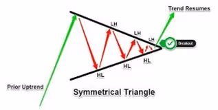 A Symmetrical Triangle pattern forms when two trend lines come together and create a triangle shape.