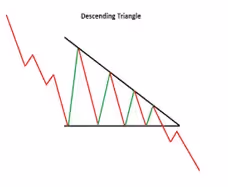A Descending Triangle is a bearish pattern that usually forms during a downtrend. It has: