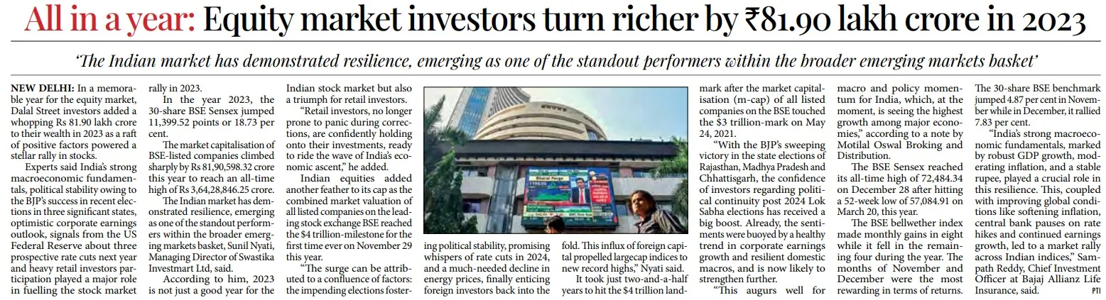 The market capitalization of BSE-listed companies climbed sharply by Rs 81,90,598.32 crore this year to reach an all-time high of Rs 3,64,28,846.25 crore.The Indian market has demonstrated resilience, emerging as one of the standout performers within the broader emerging markets basket, Sunil Nyati, Managing Director of Swastika Investmart Ltd, said.