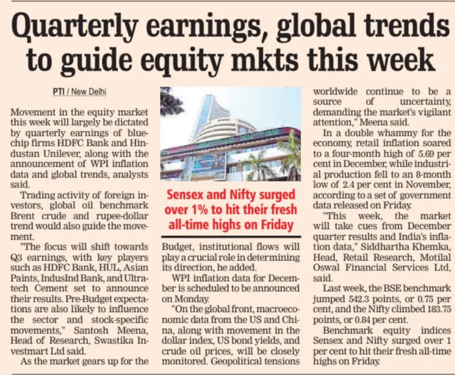 WPI inflation data for December is scheduled to be announced on Monday.On the global front, macroeconomic data from the US and China, along with movement in the dollar index, US bond yields, and crude oil prices, will be closely monitored.As the market gears up for the Geopolitical tensions source worldwide continue to be a source of uncertainty, demanding the market's vigilant attention," Meena said.