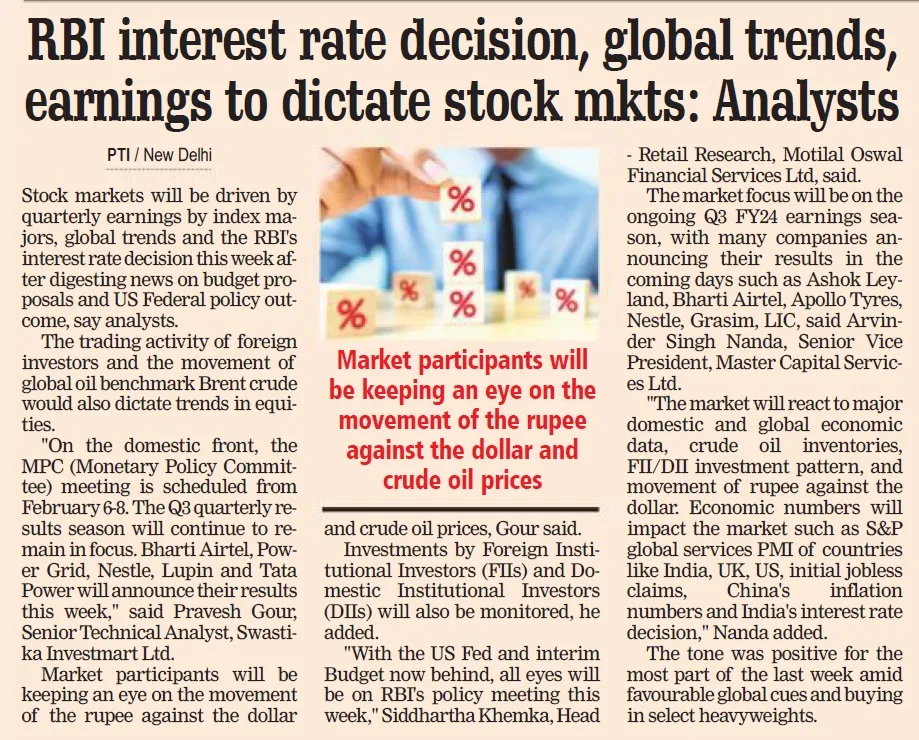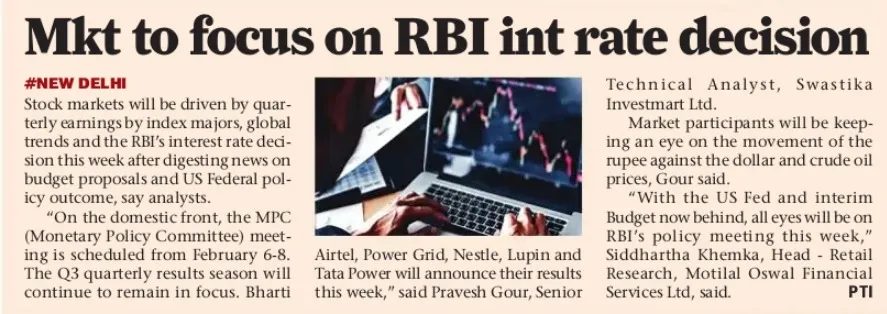 "On the domestic front, the MPC (Monetary Policy Committee) meeting is scheduled from February 6-8. The Q3 quarterly results season will continue to remain in focus. Bharti Airtel, Power Grid, Nestle, Lupin and Tata Power will announce their results this week," said Pravesh Gour, Senior Technical Analyst, Swastika Investmart Ltd.