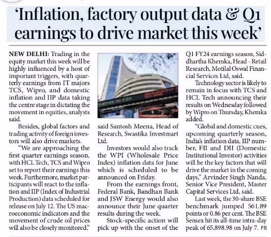 Besides, global factors and trading activity of foreign investors will also drive markets. "We are approaching the first quarter earnings season, with HCL Tech, TCS and Wipro set to report their earnings this week. Furthermore, market partici- pants will react to the inflation and IIP (Index of Industrial Pro- duction) data scheduled for re- lease on July 12. The US macro- economic indicators and the movement of crude oil prices will also be closely monitored," said Santosh Meena, Head of Research, Swastika Investmart Ltd.