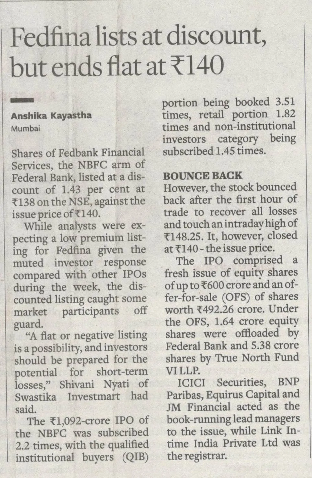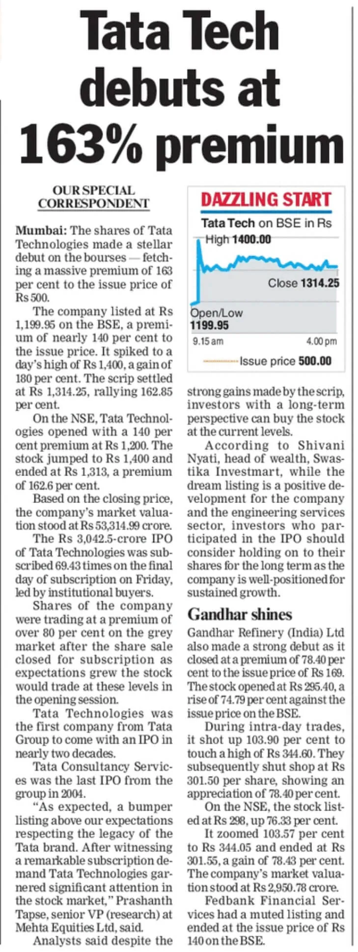 Shivani Nyati, Head of Wealth at Swastika Investmart Ltd, said: The company's strong fundamentals, robust demand for the IPO and strong listing price suggest that the company is well-posi- tioned for growth in the fu- ture. However, investors may consider to book profit.