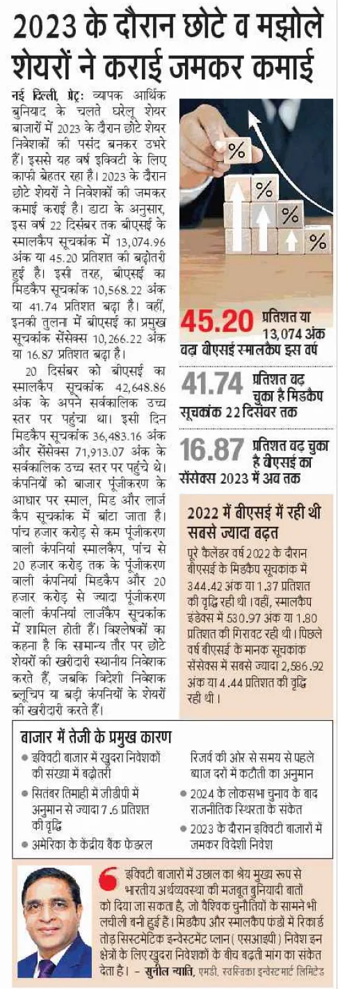 "Despite a turbulent start in 2023, plagued by inflation anxieties, interest rate jitters, and murmurs of a global recession, the Indian market defied all expectations and is poised to finish the year with a resounding victory. While the Adani saga and the Israel- Palestine conflict threw temporary wrenches in its progress, the market navigated these challenges with remarkable maturity, showcasing its inherent resilience," says Sunil Nyati, Managing Director, of Swastika Investmart, a stock broking services company.