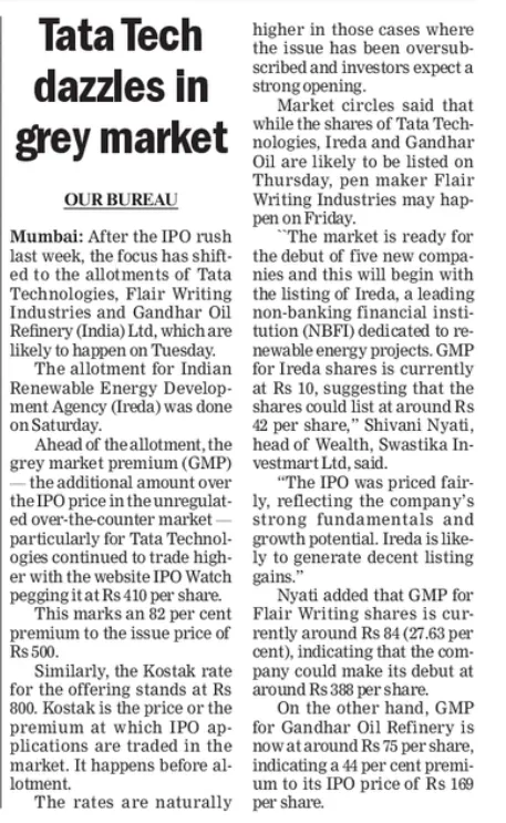 The market is ready for the debut of five new compa- nies and this will begin with the listing of Ireda, a leading non-banking financial insti- tution (NBFI) dedicated to re- newable energy projects. GMP for Ireda shares is currently at Rs 10, suggesting that the shares could list at around Rs 42 per share," Shivani Nyati, head of Wealth, Swastika Investmart Ltd, said.